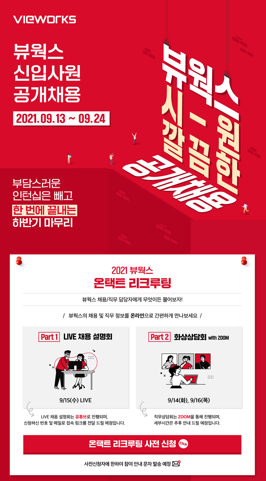 | 제목 | [채용공고] [뷰웍스] 2022 신입사원 공개채용 온택트 리쿠르팅 안내 | 날짜 | 2021-09-03 | 조회수 | 1035 |