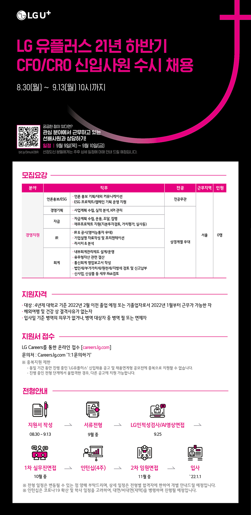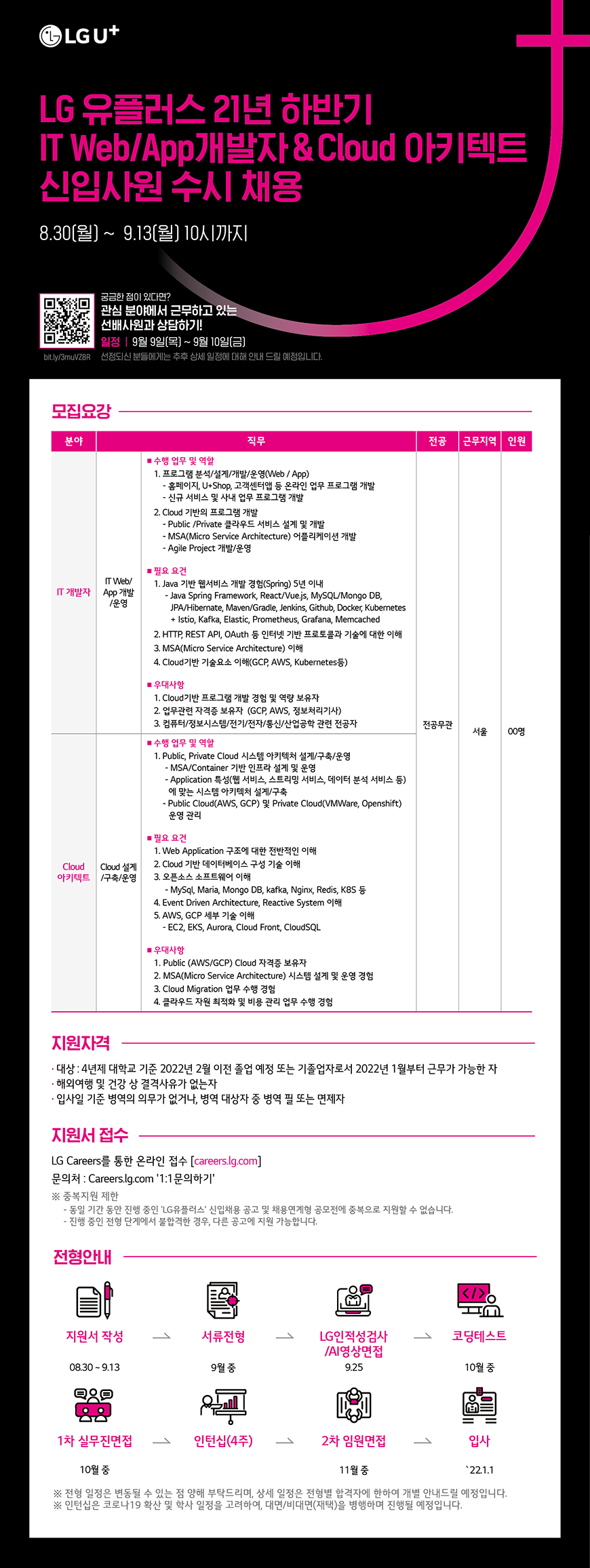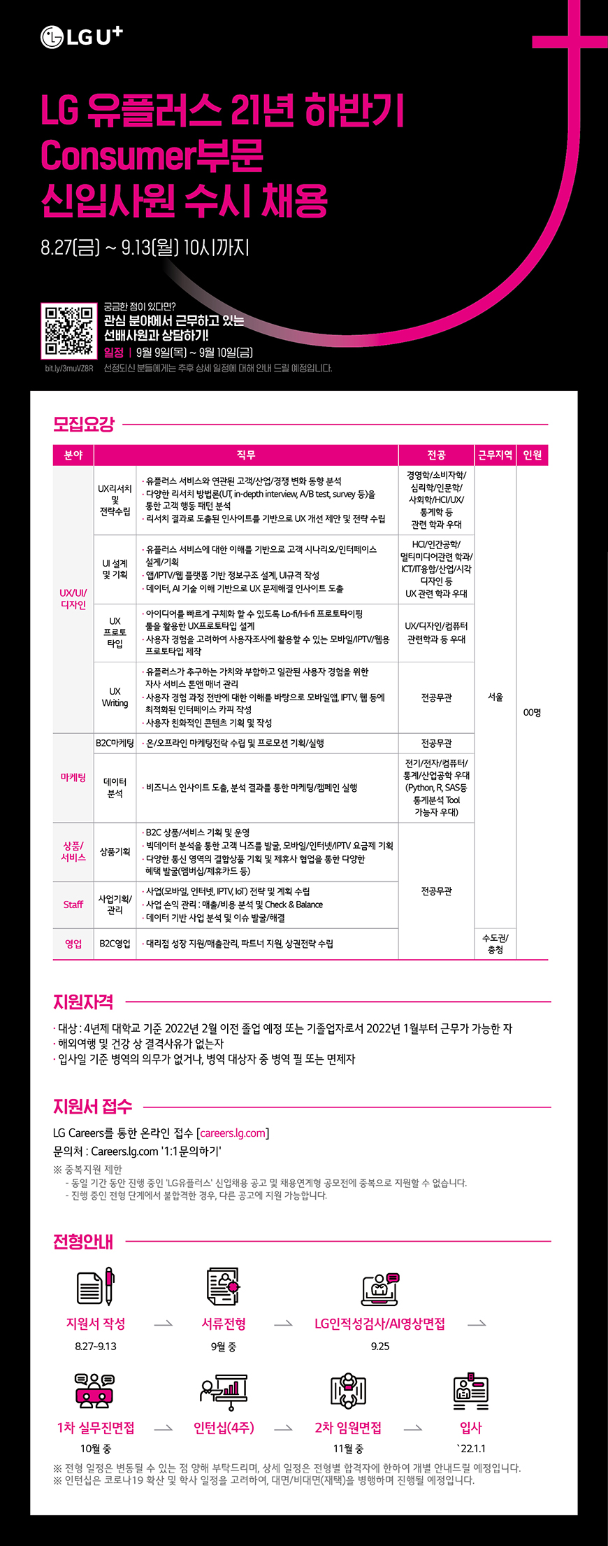 | 제목 | [채용공고] [LG유플러스] 2021년 하반기 신입사원 수시채용 | 날짜 | 2021-09-08 | 조회수 | 1041 |