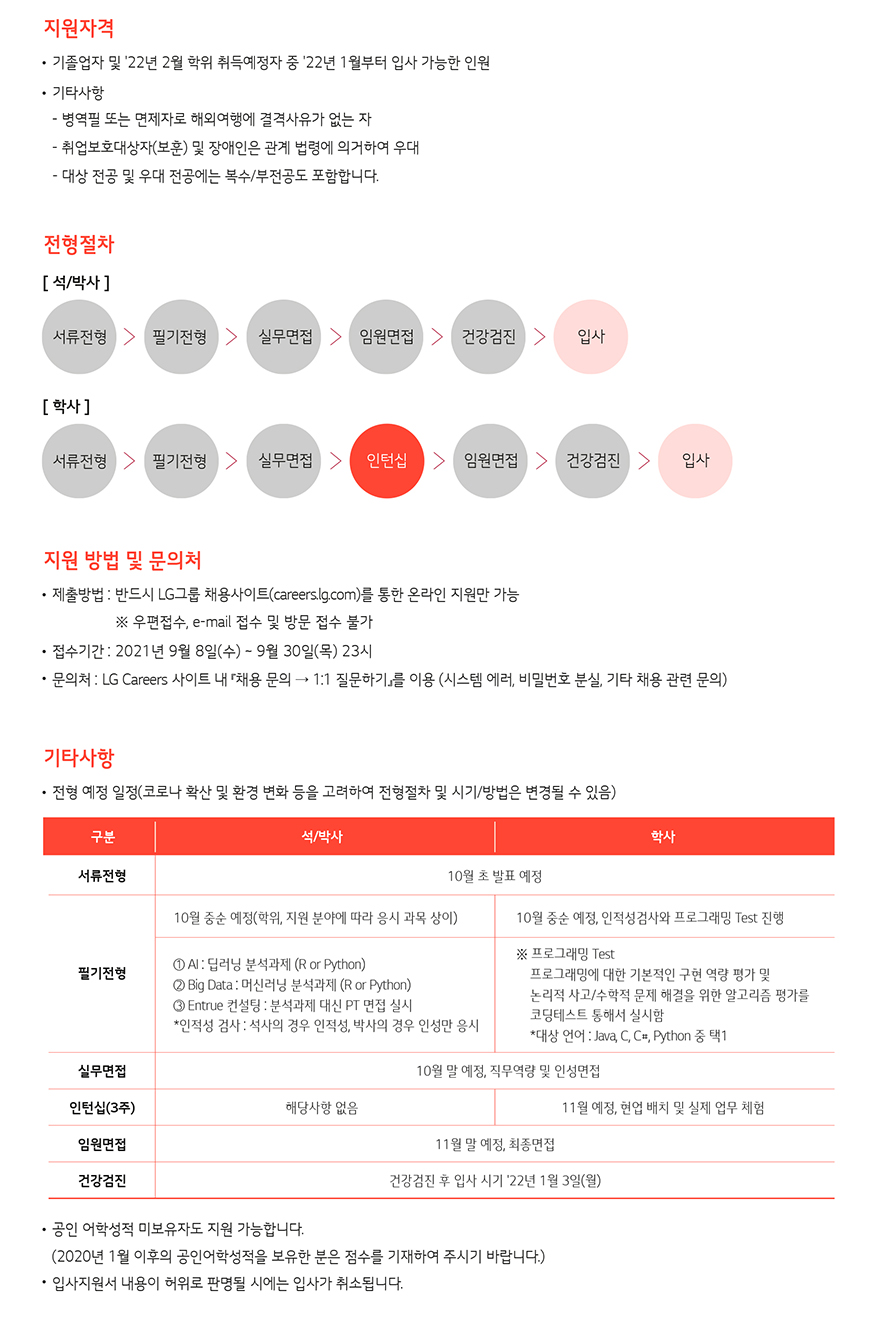 ■ 자세한 모집요강은 당사 채용 홈페이지를 참고 바랍니다. (채용공고 바로가기 ?) https://apply.lg.com/app/job/RetrieveJobNoticesDetail.rpi?jobNoticeId=15694