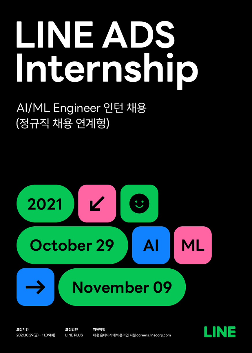 [LINE] 2021 LINE ADS AI/ML Engineer 인턴 모집 (정규직 채용 연계형)(~11/9)
