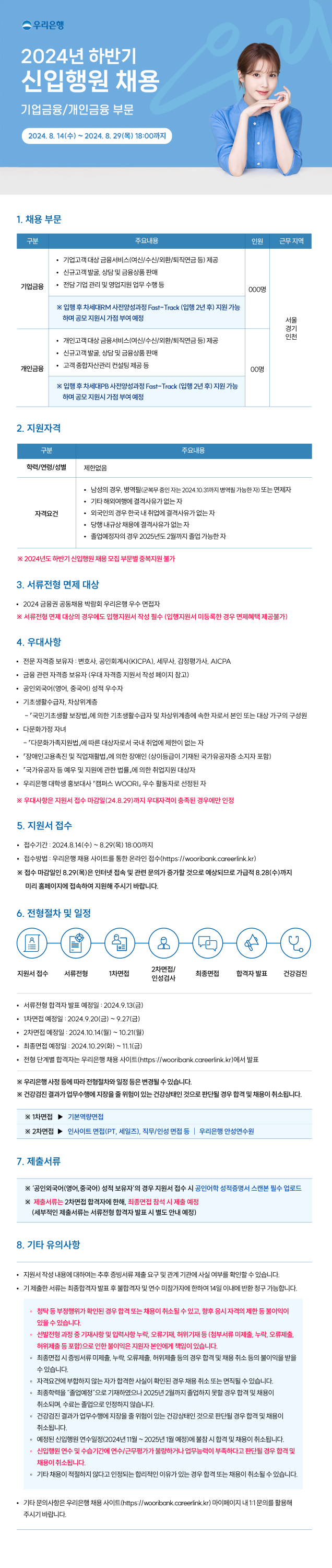 | 제목 | [우리은행] 2024년 하반기 신입행원 채용 (8/29 18시까지) | 날짜 | 2024-08-14 | 조회수 | 490 |