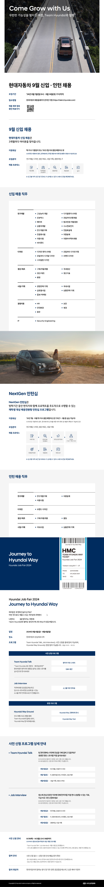 | 제목 | [현대자동차] 2024년 현대자동차 9월 신입∙인턴 채용 모집(~9/14(토)까지) | 날짜 | 2024-09-02 | 조회수 | 919 |